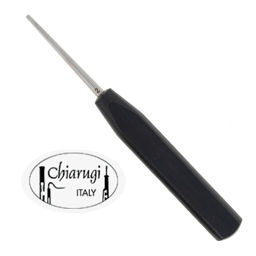 This tool is designed to fit into the throat of the reed. It has a parabolic (or tapered) design, which is unique to Chiarugi, so it goes in further than standard long mandrels. This makes this mandrel ideally suited for reed forming and other tasks like shaping because it holds the reed securely beyond the staple.
