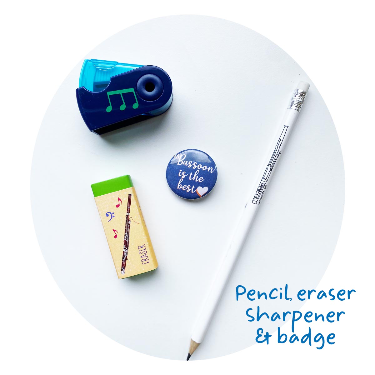 Musicians need a pencil for marking music and writing their practice journal! An eraser is essential for making changes and a sharpener for keeping the pencil ready for every musical occasion! A fun badge ads a splash of individuality to a musicians gig bag or music case.