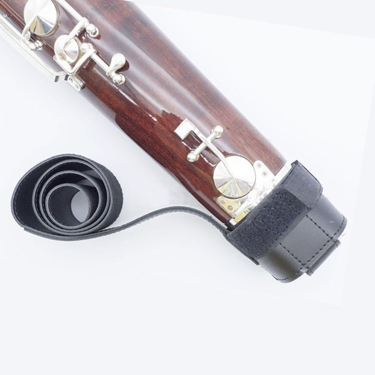 Lay the strap across the seat with the leather cup open side up. Insert the bassoon into the cup and tighten using the elastic hook and loop (velcro) fastener. Adjust strap drop to your desired playing position.